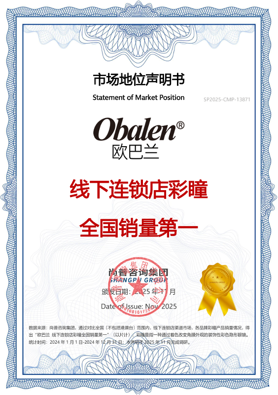 此次欧巴兰荣获尚普咨询【欧巴兰 线下连锁店彩瞳全国销量第一】市场地位声明,标志着欧巴兰在行业中的领先地位,反映了其深受消费者认可与喜爱。