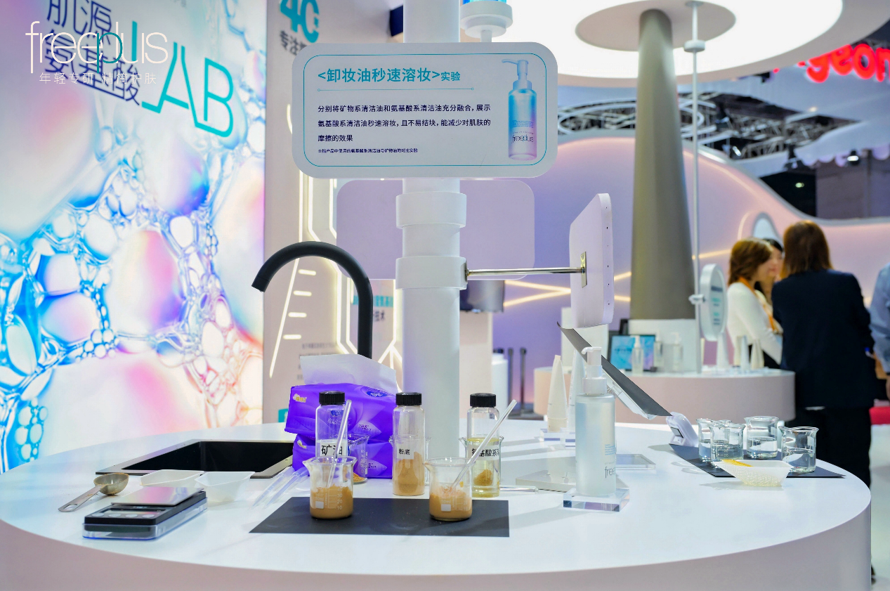 本次芙丽芳丝展台的整体设计一改传统的陈列风格,化身为一间开放式的科普实验室。其核心目的在于实现“科研可视化,价值可感知”,让每一位参观者都能在互动中理解品牌坚守40年对氨基酸成分的钻研。从氨基酸的“身世之谜”,到独家定义的“肌源氨基酸”成分,再到“专研晶析技术”实现88%高浓度氨基酸Ⅰ的创新应用,展区通过集视觉、听觉、触觉与互动于一体的沉浸式体验空间,让深奥的技术原理和品质可以看得见、摸得着。