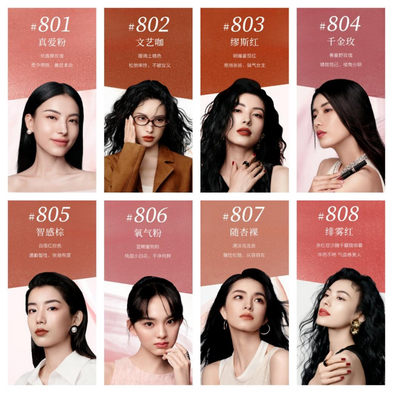 全系列8个色号,满足多样化需求:#801真爱粉为优雅裸玫瑰色,色调柔和,黄皮也能轻松驾驭;#802文艺咖是暖调土橘色,自带松弛的文艺气质;#803缪斯红为明媚番茄红,色彩鲜活,适合展现大女主气场;#804千金玫呈现春夏野玫瑰的质感,自带矜贵感;#805智感棕为百搭红棕色,色调沉稳,营造从容笃定的精英感;#806氧气粉是蜜桃粉调,透着灵动气息,风格清新;#807随杏裸为清淡乌龙杏色,贴近原生唇色,日常涂抹毫无违和感;#808绯雾红为赤红豆沙调,色彩浓郁却不过分艳丽,能自然衬托气色。